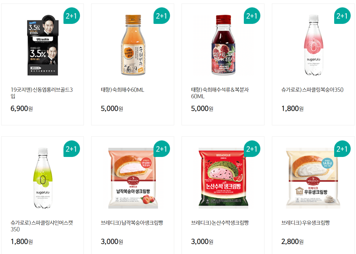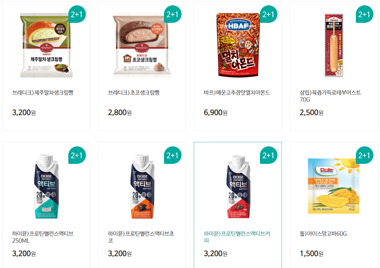 gs25 7월 할인 행사는 1+1 뿐만 아니라 2+1 행사도 함께 진행되고 있습니다. 2+1 제품으로는 요즘 핫한 크림빵류와 건망고, 홍삼절편 등이 있네요.